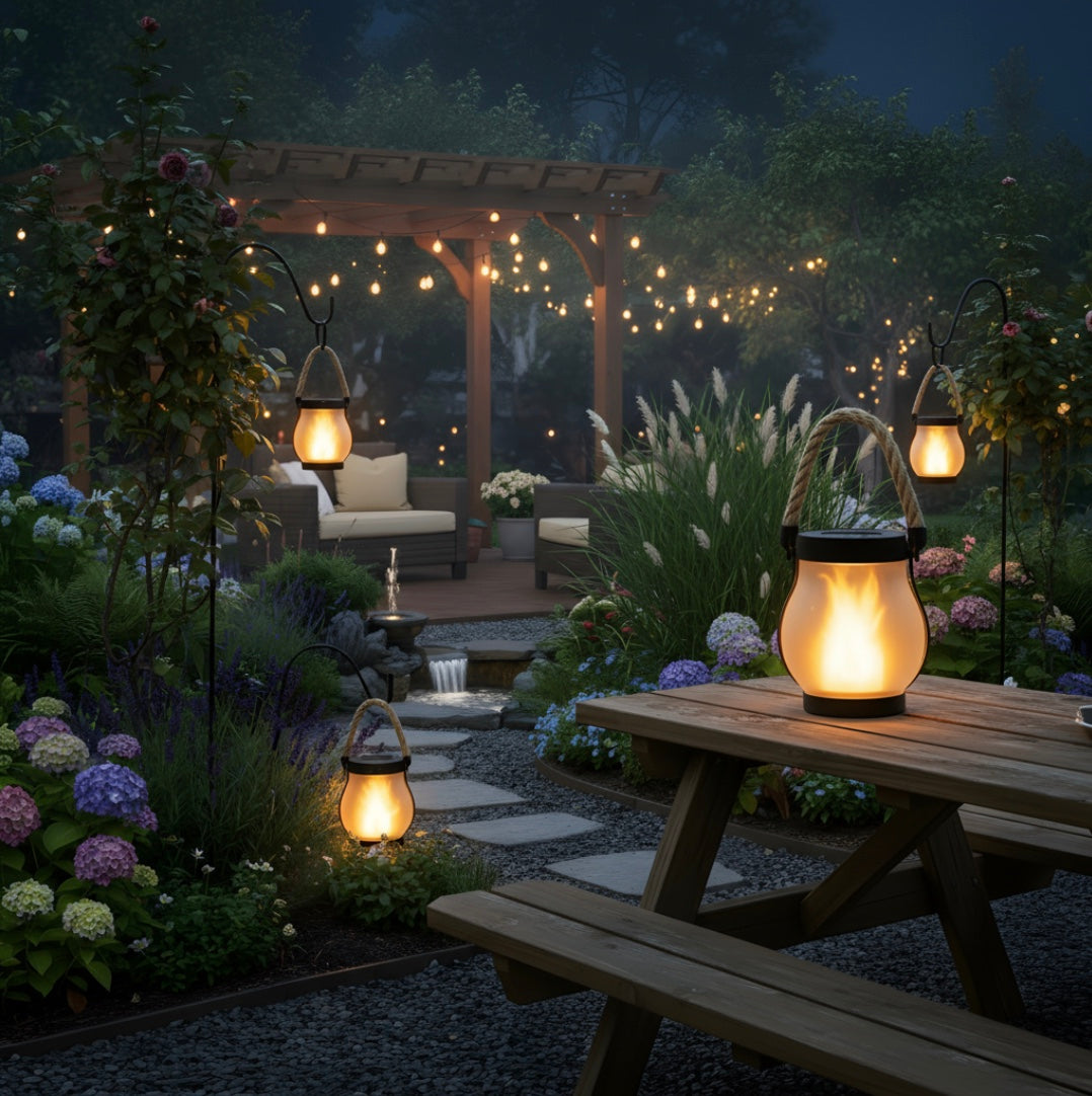 La lanterne Kaliqo diffuse une lumière chaude et vivante qui sublime votre jardin, terrasse ou balcon, quelle que soit la saison.